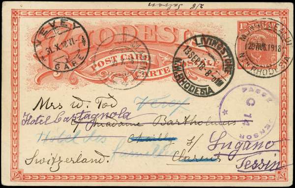 Postal Stationery. 1918 (29 AUG) 1d red “Admiral” post card, used from Mongu Lealui to Switzerland (twice re-addressed), Missionary correspondence, cancelled by mostly very fine strike of MONGU-LEALUI / NTH RHODESIA cds with Livingstone (13 SEP), Ur-Classens (30 Oct) and Vevey (31 Oct) transit cancels and violet "PASSED BY CENSOR / C 14" censor mark alongside. A fine and rare usage. Ex Swart.
