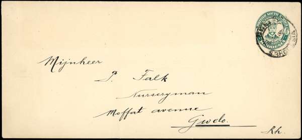 Postal Stationery. 1923 (6 DEC) ½d green “Admiral” envelope (229 x 105mm), locally addressed and cancelled by mostly fine strike of GWELO / S. RHODESIA cds. Folded at left, but much fresher than normally found and very scarce.