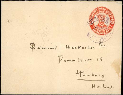 Postal Stationery. 1922 (NOV) 1d red “Admiral” envelope (124 x 96mm), used from Mongu Lealiu to Hamburg, cancelled by good to fine strike of MONGU-LEALIU / NTH RHODESIA cds in VIOLET, with Livingstone transit (8 DEC) backstamp. Lightly folded, but a rare usage, this cancel not previously seen by us in violet.