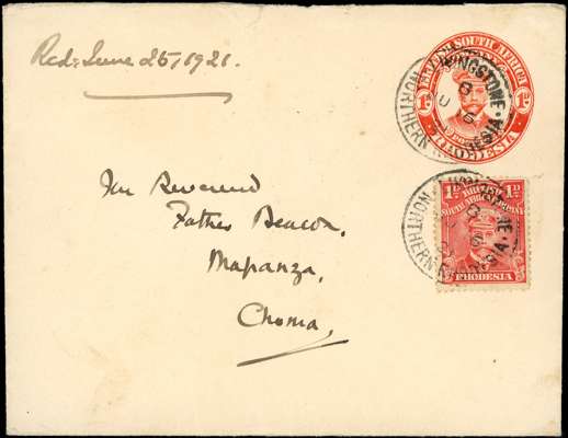 Postal Stationery. 1921 (JU 16) 1d red “Admiral” envelope (124 x 96mm - with embossed imprint), used from Livingstone to Mapanza, Choma, and uprated with 1913-19 1d “Admiral”, perf 14, with two fine strikes of LIVINGSTONE / NORTHERN RHODESIA cds and CHOMA / N.W. RHODESIA arrival backstamp (17 JUN). A fine and scarce usage. Ex Swart.