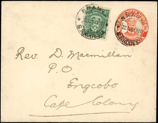 Postal Stationery. 1920 (22 AUG) 1d red “Admiral” envelope (124 x 96mm - with embossed imprint), used from Shamva to Engcobo, South Africa, uprated with 1913-19 ½d “Admiral”, perf 14, with two fine strikes of SHAMVA / S. RHODESIA cds. A fine and attractive usage.