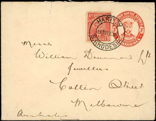 Postal Stationery. 1920 (18 MAY) 1d red “Admiral” envelope (124 x 96mm - with embossed imprint), used from Hartley to Melbourne, Australia, uprated with 1913-19 1d “Admiral”, perf 14, with single superb strike of HARTLEY / S. RHODESIA cds. Trivial blemishes but a scarce overseas usage.