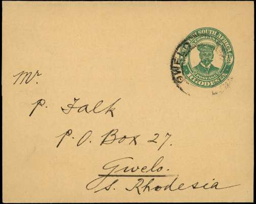 Postal Stationery. 1923 ½d green “Admiral” newspaper wrapper, Falk correspondence, locally addressed and cancelled by mostly part strike of GWELO / S. RHODESIA cds, showing year date “23”. Fine and very scarce, with only 24 used examples recorded.