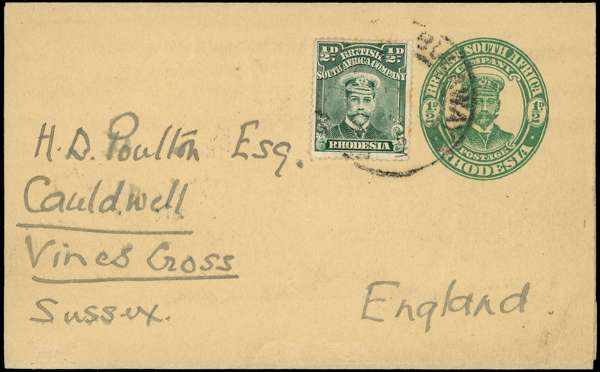 Postal Stationery. 1916 (c.) ½d green “Admiral” newspaper wrapper, addressed to England and uprated with 1913-19 ½d, perf 14, tied by indistinct Bulawayo cds (partial year date “2” visible). A fine and possibly unique usage. Ex Menuz.