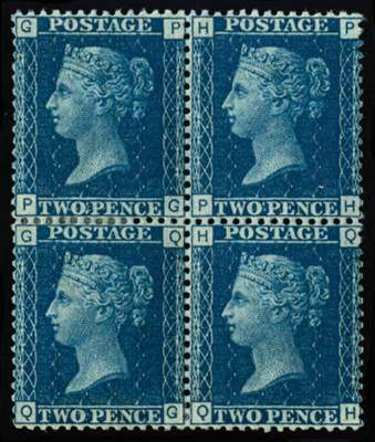 1869 2d Blue Pl.13. Very fine and fresh unused o.g. well centred block of four lettered PG-QH, a couple reinforced perforations at left nevertheless a difficult multiple. Spec. G3(1). SG 47
