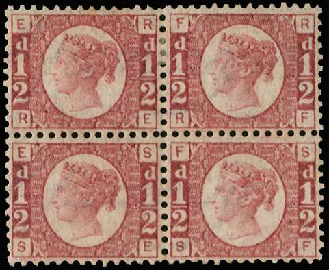 1870 ½d Rose red Pl.19. Very fine unused o.g. (two stamps unmounted o.g.) perfectly centred block of four lettered RE-SF. A rare multiple in this quality. SG 48
