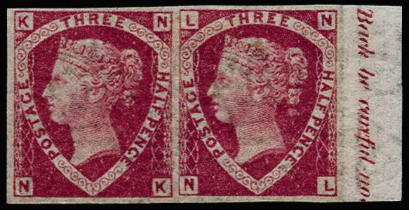 1870 1½d Rose red Pl.1. (Dr. Perkins blued paper). Very fine and fresh unused o.g. right hand marginal imperforate horizontal pair printed on Dr. Perkins blued security paper lettered NK-NL. Wonderful fresh colour and gum, a very rare multiple. Spec. G6(1)g. Ex. "Verus". SG 51var