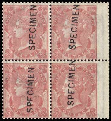 1861 3d Rose Pl.2 (State 1with shaded spandrels). Superb unused o.g. block of four lettered GG-HH lightly mounted on top two stamps only, overprinted "SPECIMEN" type 6. Lovely fresh colour, very rare in this quality. Spec. J25As. SG 75var