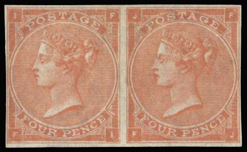 1862 4d Pale red Pl.4. Very fine and fresh unused o.g. horizontal imperforate pair lettered FI-FJ accompanied by 1995 BPA Cert. Very scarce so fine. SG 82a