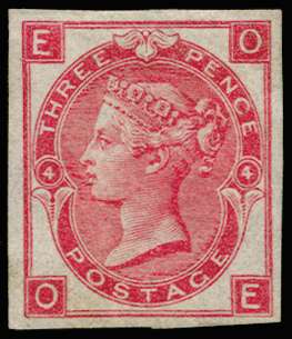 1865 3d Rose Pl.4. Very fine unused imperforate plate proof lettered OE printed in rose on gummed unwatermarked paper. A magnificent example of this rare plate proof. Ex. "Verus". SG 92var