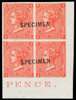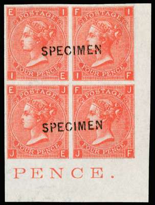 1870 4d Vermilion Pl.12. Very fine and fresh unused o.g. bottom right hand corner marginal imperforate block of four lettered IE-JF showing part sheet inscription, overprinted "SPECIMEN" type 6. Scarce. Spec. J59s. SG 94var