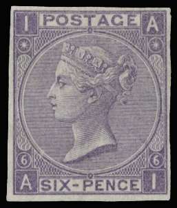 1865 6d Deep lilac Pl.6. Very fine unused imperforate plate proof lettered AI printed on ungummed, unwatermarked wove paper. Very scarce. SG 96var