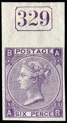 1870 6d Mauve Pl.9. Very fine unused o.g. top marginal imperforate imprimatur lettered AB showing current number “329“. Very rare, unique in private hands. Ex. Beaumont & Serval. SG 109var