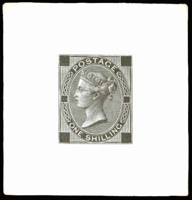 1871 1s Die proof. Very fine example printed in black on matt card (47 x 49mm) with corner letters and plate numbers uncleared. Printed by DLR for the 1871 London International Exhibition. SG 117var