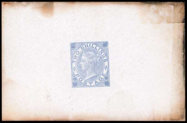 1867 2s Die proof. Very fine example printed in pale chalky blue on white glazed card (92 x 60mm), produced by DLR for the 1867 Paris International Exhibition. With the usual peripheral staining from the frames used at the exhibition. Very rare only one or two examples exist in each colour in private hands. SG 118var