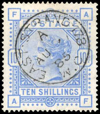 1883-84 10/- cobalt (AF) on white paper, struck by clear strike from East Strand cds for AU ?? 85, slightly short perf at right, mentioned for accuracies sake, still a very fine and attractive example of this scarce stamp with good centring. SG 182 £7500