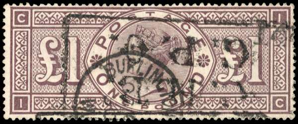 1884 £1 brown-lilac, watermark Three Imperial Crowns, ironed out vertical crease at left still a visually appealing, collectable used example SG 185