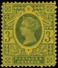 1887 3d "Jubilee" Colour Trial (Line Perf 14). Very fine peforated example printed in green on yellow, gummed, Crown watermarked paper. A stunning example of this great rarity. Ex "Aureum". SG 203var