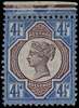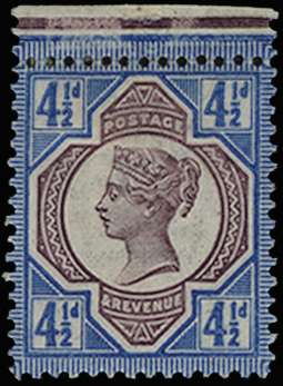 1892 4½d "Jubilee" Colour Trial (Line Perf 14). Very fine top marginal perforated colour trial on gummed, Crown watermarked paper. Head plate printed in purple and duty plate in blue. Scarce. Ex "Aureum". SG 206var