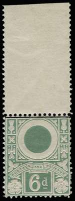 1887 6d "Jubilee" Essay (Line Perf 14). Very fine top marginal unadopted trial as Type B, printed in pale green with additional embossing to parts of the design and solid colour circle in head area. Numerous minor differences can be seen compared to the eventual adopted design the most obvious of which is the additional line under the "d" of 6d. Very scarce. Ex. "Aureum". SG 208var