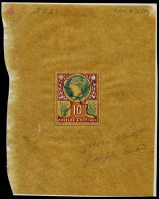 1889 10d "Jubilee" Essay. Very fine hand painted essay in red & green with details of the design highlighted in Chinese white and cancelled with a manuscript pen cross, executed on a piece of tracing paper (65 x 85mm) numbered "6" and dated "March 15/89". One of a series of 10 essays produced by DLR for the new 10d value. A spectacular and unique essay. Ex. DLR Archive & "Aureum". SG 210var