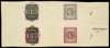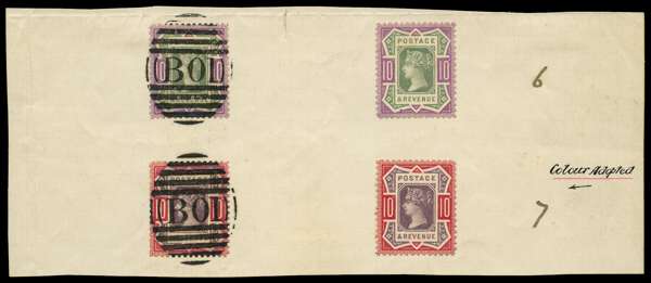 1890 10d "Jubilee" Colour Trials. A magnificent piece from the DLR archives bearing four 10d colour trial's on white, Crown watermarked paper (Line perf 14) the top pair with the head plate's printed in green and the duty plate's in bright purple and the bottom pairs head plate's printed in purple and the duty plate's in red. The left hand stamp of both trials cancelled by a crisp black "B01" trial cancellations. Numbered in manuscript next to each row "6" & "7" respectively with "Colour Adopted" endorsed next to the 10d in purple and red. A spectacular exhibition showpiece, Unique in private hands. Ex. "Aureum". SG 210var