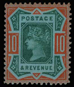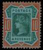 1892 10d "Jubilee" Colour Trial (Line Perf 14). Very fine perforated colour trial on blue, gummed, Crown watermarked paper. Head plate printed in green and duty plate in orange. Ex. "Aureum". SG 210var