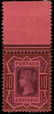 1892 10d "Jubilee" Colour Trial (Wmk. Inverted, Line Perf 14). Very fine top marginal perforated colour trial on red, gummed, Crown watermarked paper. Head plate printed in purple and duty plate in brown. Scarce. Ex. "Aureum". SG 210var
