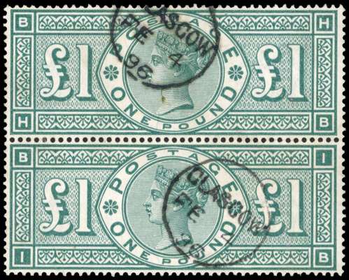 1890 £1 green vertical pair (lettered HB-IB), cancelled by crisp Glasgow CDS's for 'FE 4 1896', good colour, scarce multiple, fine used SG 212