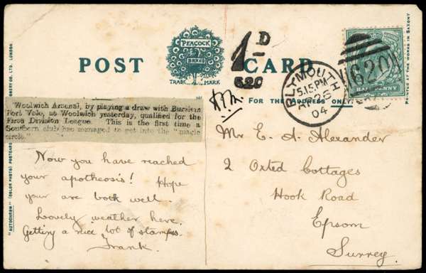 1904 Contrary to Regulations Postcards. Fine picture postcard of Plymouth Pier sent from Plymouth to Epsom bearing ½d Dull blue-green (SG 215) tied by a Plymouth '620' duplex for AP.26.1904. Bearing a newspaper clipping alluding to Woolwich Arsenal (Arsenal Football Club) gaining promotion to the English First Division after a 1-1 draw at home against Burslem Port Vale (Port Vale F.C.) the day prior to the mailing on AP.25.1904, charged an additional 1d due to the contrary nature of this postcard. Woolwich Arsenal's promotion was the first time a southern club had been promoted to the top tier of English Football and was described in the clipping as "getting in the magic circle". Some minor toning and creasing nevertheless a wonderful postcard bearing a small piece of English footballing history, ideal for any Arsenal fan.