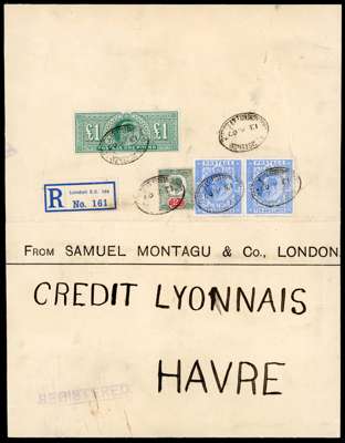 1907 large linen backed registered parcel piece (186 x 244mm) franked by 2d grey-green & carmine, 10/- ultramarine horizontal pair and £1 dull blue-green, tied by Threadneedle Street B.O. E.C registered ovals for 13 JUL, with registration label at left and straight lined h/s in violet, minor creasing at to be expected, still attractive and scarce high franking. SG 226,265 & 266