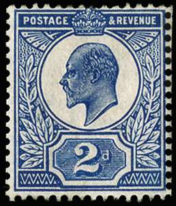 1909 2d Colour trial. Very fine example printed in deep blue on gummed, Crown watermarked paper. Produced for the proposed monocolour issue that was subsequently abandoned on the death of the King. Very rare, no more than two or three examples of each colour recorded in private hands. Ex. "Aurelius" & "Minoru". SG 225var