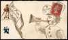 1872 Hand Illustrated Mail. Spectacular hand illustrated envelope depicting a Postman blowing a horn with the stamp (1d Rose-red Pl.154, SG43) incorporated as his hat, with a soldier holding a flag at left in which the address is written. Sent from Clonmel and cancelled by a neat Clonmel ‘142’ Irish numeral for DE.24.1872. With an arrival datestamp on reverse for Christmas day. Additional illustrated flower at lower left and a butterfly on reverse. Magnificent. SG43.