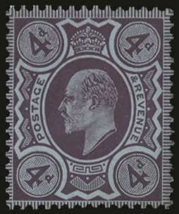 1909 4d Colour trial. Very fine example printed in purple on blue tinted (White backed) gummed, unwatermarked paper. Produced for the monocolour issue using the original bi-coloured plates. Very rare, no more than two or three examples of each colour recorded in private hands. Ex. "Minoru". SG 240var