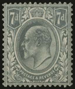 1910 7d Colour trial. Very fine example printed in grey on gummed, Crown watermarked paper. Produced for the monocolour issue. Very rare, this being the chosen as the issued colour. No more than two or three examples of each colour recorded in private hands. Ex. "Chartwell" & "Minoru". 1991 RPS Cert. SG 249var