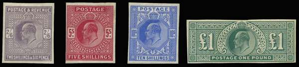1902 2s6d, 5s, 10s & £1 High values. The unique unused o.g. set of four imperforate imprimaturs. Vertical crease at left of 5s not detracting from this magnificent set of the utmost rarity, unique in private hands. Each accompanied by a RPS Certificate. Spec. M48var, M51var, M53var, & M55var. Ex. "Minoru". SG 260/6var