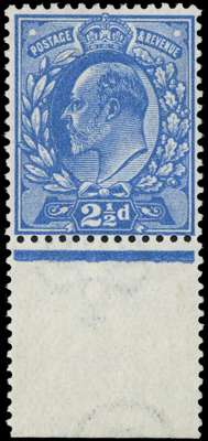 1911 Harrisons 2½d bright blue, lower marginal, showing variety WATERMARK INVERTED, with the displaced wmk clearing visible in the sheet margin, brilliant o.g. very fine example of this scarce wmk variety. SG 276wi