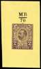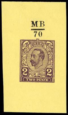 1910 2d Hentschel colour essay. Very fine example printed in purple on yellow wove paper (33 x 58mm) with handstruck “MB/70“ above design. Most attractive and scarce.