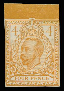 1911 4d Engraver's sketch die (Die 2 Head). Very fine uncleared cut close example with part top margin printed in orange with shaded background to head on proof paper. A most attractive and rare proof. Fig. 24a.