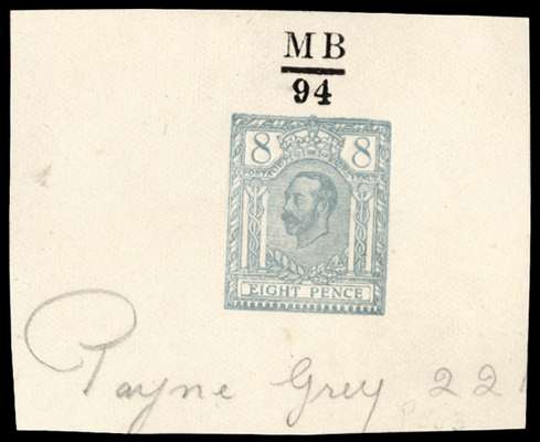 1910 8d Hentschel colour essay. Very fine example printed in pale grey on white wove paper (59 x 48mm) with handstruck "MB/94" above design and manuscript "Payne Grey 22" below. Most attractive and scarce.