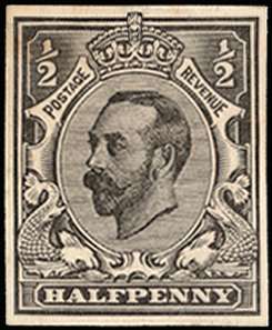 1911 ½d Plate proof (Accepted die 1a). Very fine unused imperforate example printed in black on thick white paper. Scarce. See Specialised Vol.2 Catalogue pg.92. SG 321var