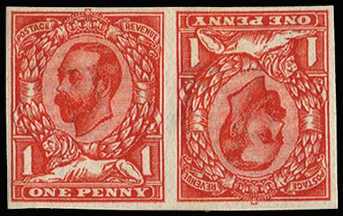 1911 1d Pale carmine red (Die 1b, Wmk. Crown). A very fine unused part o.g. imperforate tête-bêche imprimatur pair from the Post Office booklet registration sheet. A great rarity only one or two pairs in private hands. 1993 BPA Cert. SG 329var