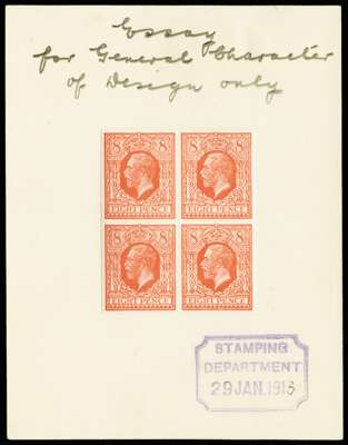 1912 8d Eve's Pillar Design essay. Very fine unused o.g. imperforate block of four printed in brown-orange on simple cypher watermarked paper, mounted on white card (88 x 114mm) endorsed "Essay for General Character of Design only" at top and with "Stamping Department 29 JAN. 1913" purple handstampat lower right. Fig. 33a. Most attractive and rare. SG 390var
