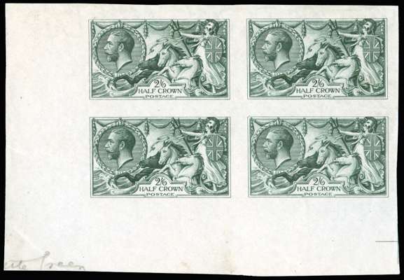 1913 2s6d "Seahorse" Colour trials. Very fine and fresh unused imperforate bottom left hand corner marginal block of four printed by Waterlow in bottle green on ungummed "JAS WRIGLEY LD-219" watermarked paper. The watermark clearly showing across the top two stamps and annotated in manuscript at lower left "ttle Green". A very attractive and rare positional block. SG 399var