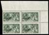 1913 £1 Yellowish green (Colour trial). Pristine unmounted o.g. top right hand corner marginal block of four of this scarce trial printing on Joynson paper, overprinted "CANCELLED" type 24. Very rarely seen so fine. SG 403var