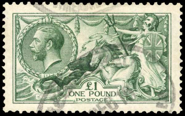 1913 £1 green cancelled with part of two indistinct cancels, still a collectable example of this popular stamp, used. SG 403