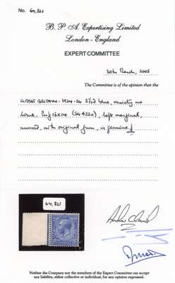 1924 2½d blue, left hand marginal example, no watermark, BPA certificate (2005) fine o.g. SG 422a
