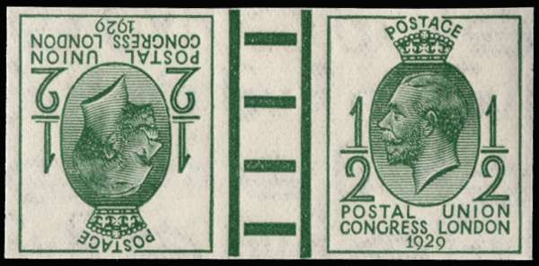 1929 ½d Green Postal Union Congress. Superb unmounted o.g imperforate tête-bêche gutter pair of imprimaturs showing marginal pillars with "BPMA" handstamps on reverse. Very rare. SG 434var