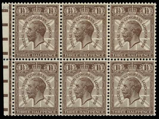 1929 1½d Postal Union Congress. Very fine unused o.g. booklet pane (three stamps unmounted o.g. including variety) showing "Q for O in Union" variety in position R.2/1. Very scarce. Spec. NComB3b. SG 436var