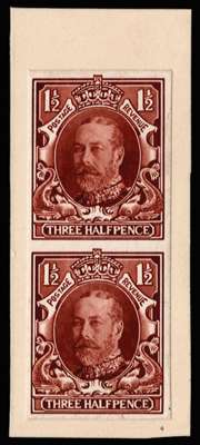 1934 1½d "Photogravure" essay. Very fine vertical pair of imperforate essays printed by Harrison & Sons on "Harrison" script gummed watermarked paper, mounted on a small piece of cream card. Printed in red brown and using the Lafayette portrait design (Type D). A very attractive and rare unnadopted essay. See Specialised catalogue Vol.2 pg.178 SG 441var